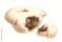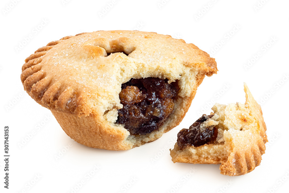 • Broken open traditional british christmas mince pie with fruit filling isolated on white.
