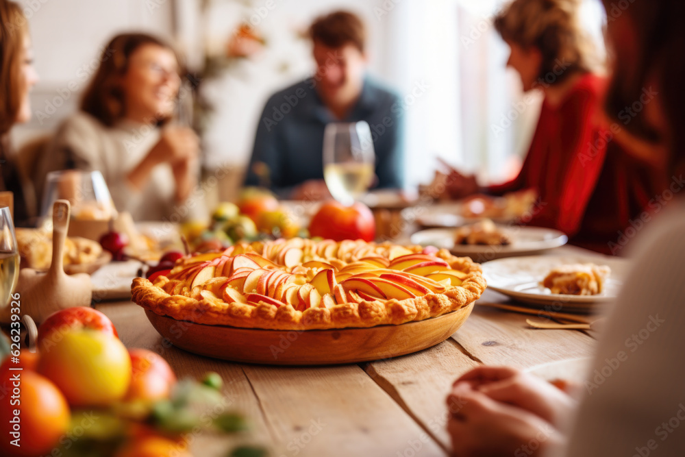 • Thanksgiving family dinner. Traditional apple pie and vegan meal close up, with blurred happy people around the table celebrating the holiday.