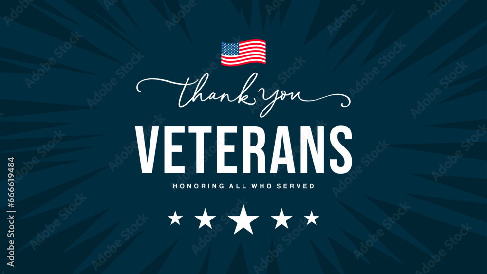 • Thank you Veterans, Honoring all who served, USA, Veterans day thank you, cards, thank you Veterans text with American flag for social media, header, vintage, veterans day banner, vector, printable