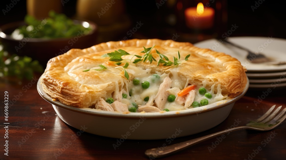 • A comforting bowl of chicken pot pie with a golden crust. AI Generative