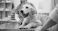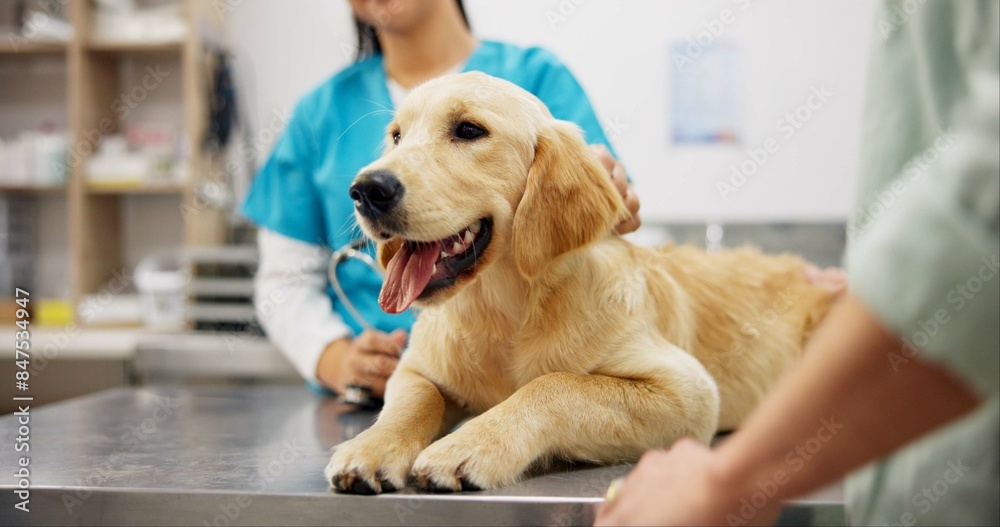 • Hands, vet and dog at clinic with consulting, care and stroke for health, development and growth with wellness. People, doctor and golden retriever pet in assessment, exam or help at animal hospital