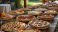 • A long table set with a variety of freshly baked pies all made from ingredients grown on local farms.