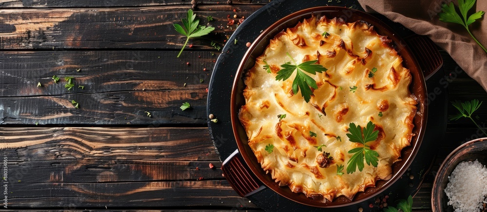 Plakat do Gabinetu Weterynaryjnego - English fish pie presented on a black wooden backdrop with ample copy space image #880354055
