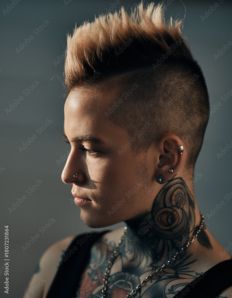 • Osoba z tatuażami na ciele, kolczykami i krótko ostrzyżonymi uniesionymi na czubku głowy włosami, Indywidualizm, moda, ekspresyjny wygląd