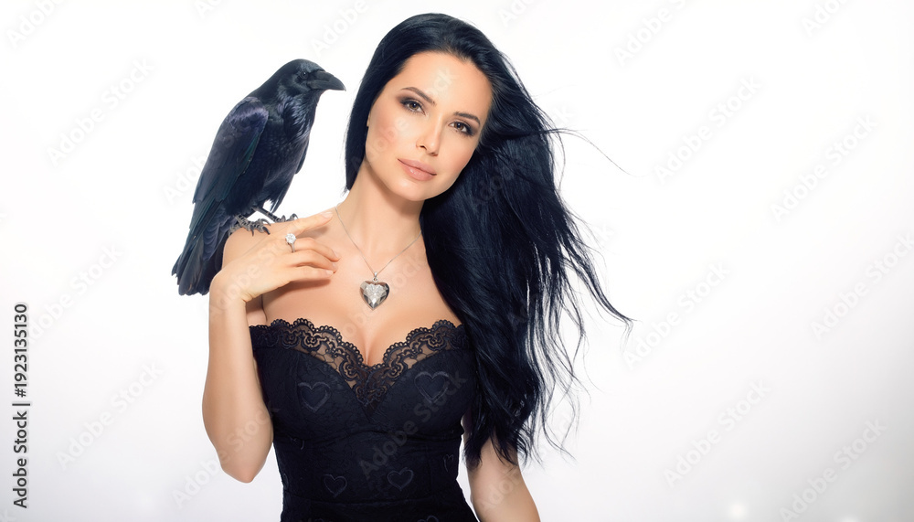 • Atrakcyjna kobieta z czarnymi włosami oraz czarnej sukni z krukiem na ramieniu