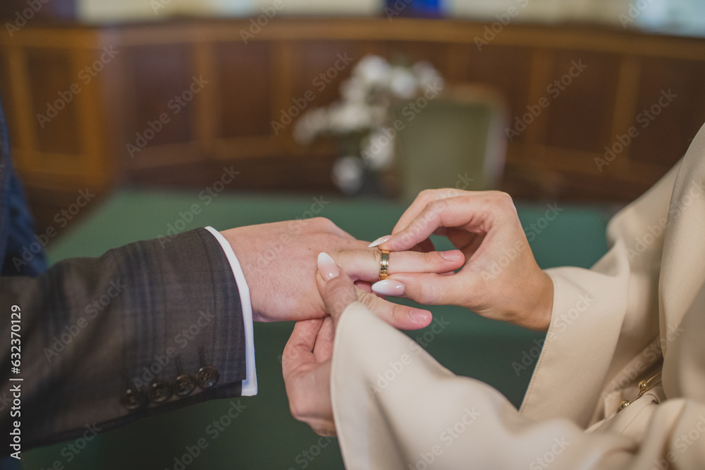 Plakat do Jubilera - Pan młody zakłada Pani młodej pierścionek na palec. Ślub w urzędzie. Obrączka na palcu. The groom... #632370129