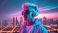 • Mężczyzna w stylu świata synthwave, a w tle miasto retrowave. AI Generative.