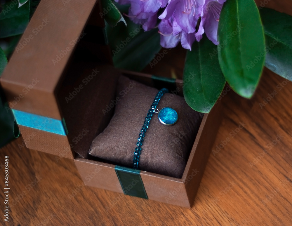 • Bransoletka handmade z niebieskich kryształów ze szklanym ręcznie malowanym niebieskim oczkiem. Biżuteria w brązowym pudełku z niebieską wstążką z fioletowym kwiatem w tle