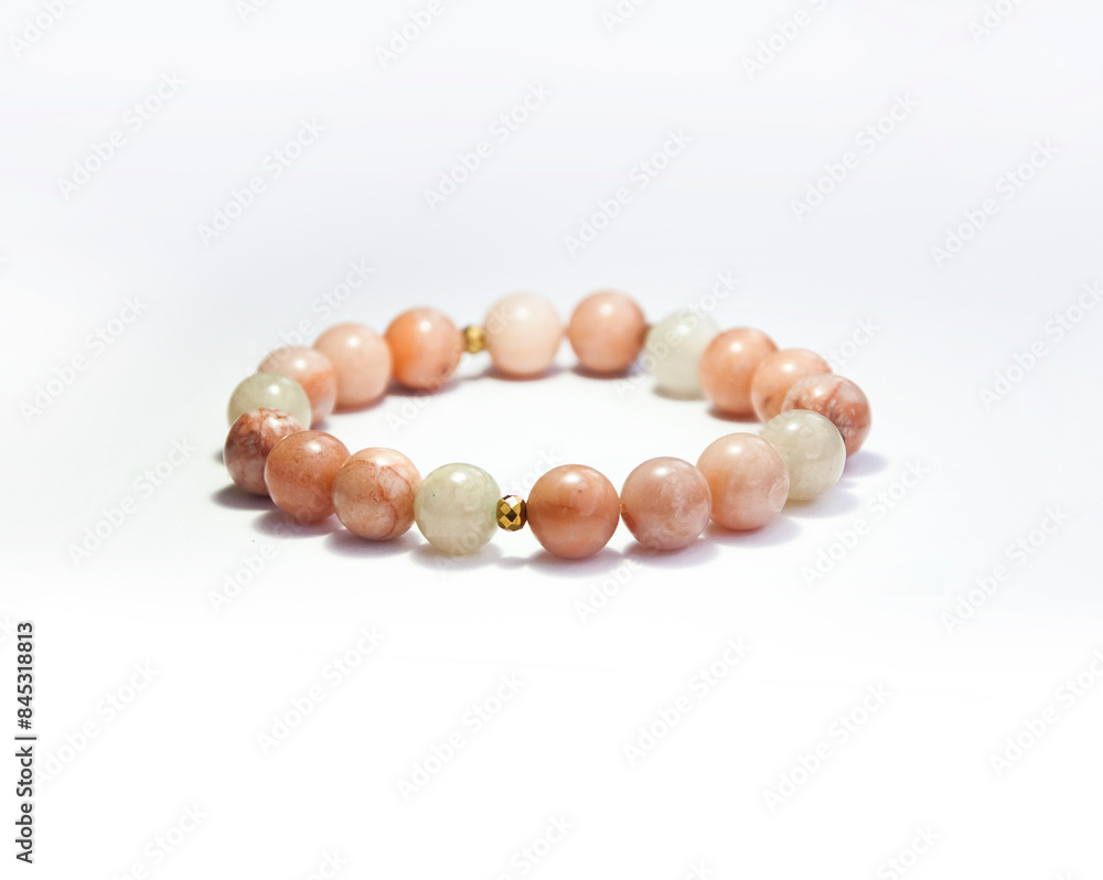 Plakat do Jubilera - Morelowa bransoletka z agatami i jadeitem oraz złotym hematytem na białym tle. Piękna biżuteria z... #845318813