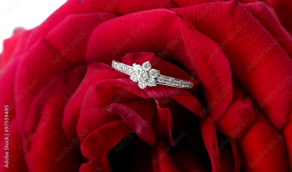 Plakat do Jubilera - Piękny pierścionek zaręczynowy między płatkami róży #97559495