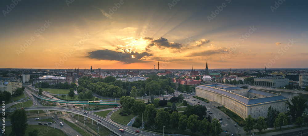 • Widok z lotu ptaka na zachodzące słońce nad miastem - Wrocław, Polska