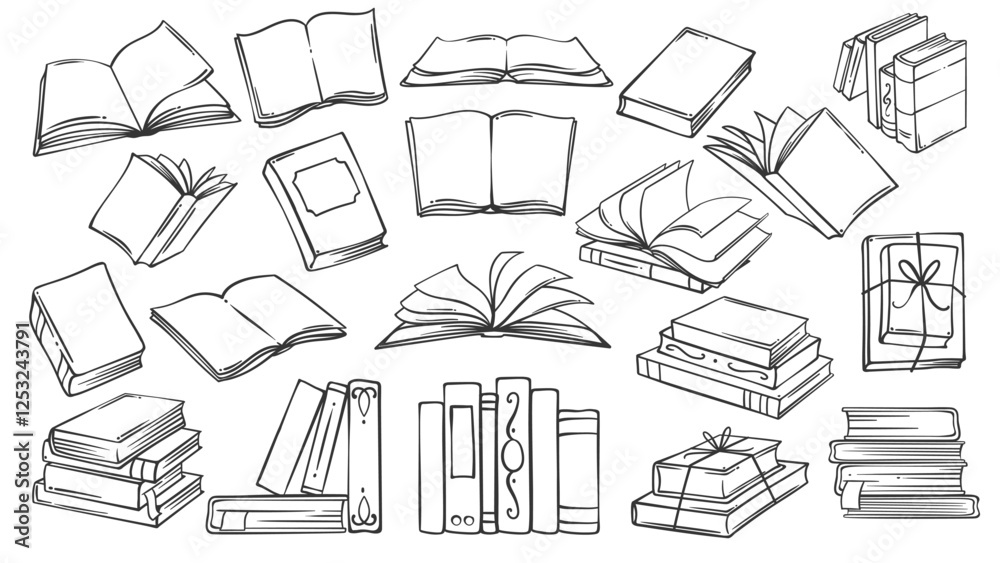 • Open and closed paper books, bookshelf stack line icon. Outline hand drawn vintage diary, literature of bookstore, side and top view. Library mascots, simple books icon collection vector illustration