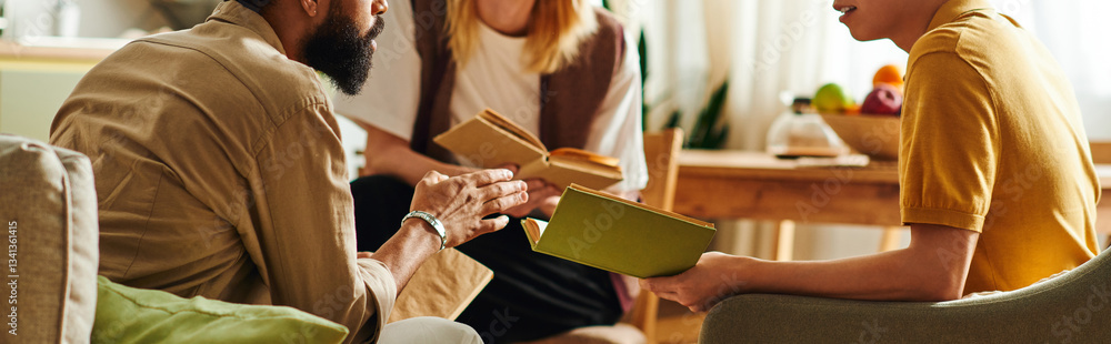 Plakat do Księgarni - Engaging conversation among young men in contemporary book club at home during a cozy gathering #1341361415