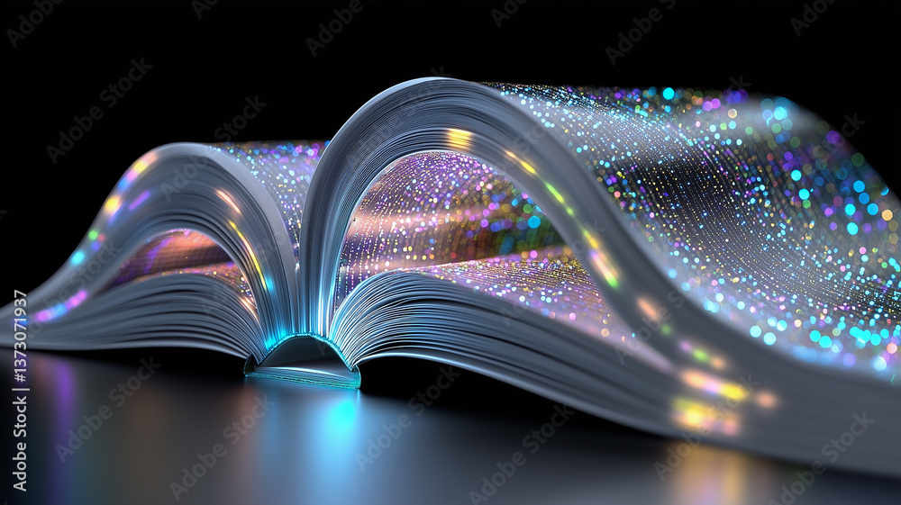 • Holographic digital book with glowing AI-driven pages, futuristic cyberpunk concept, innovation, virtual intelligence, and modern technology.