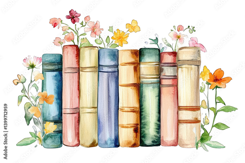 • watercolor illustration of stacked books adorned with colorful flowers symbolizing knowledge and the beauty of literature