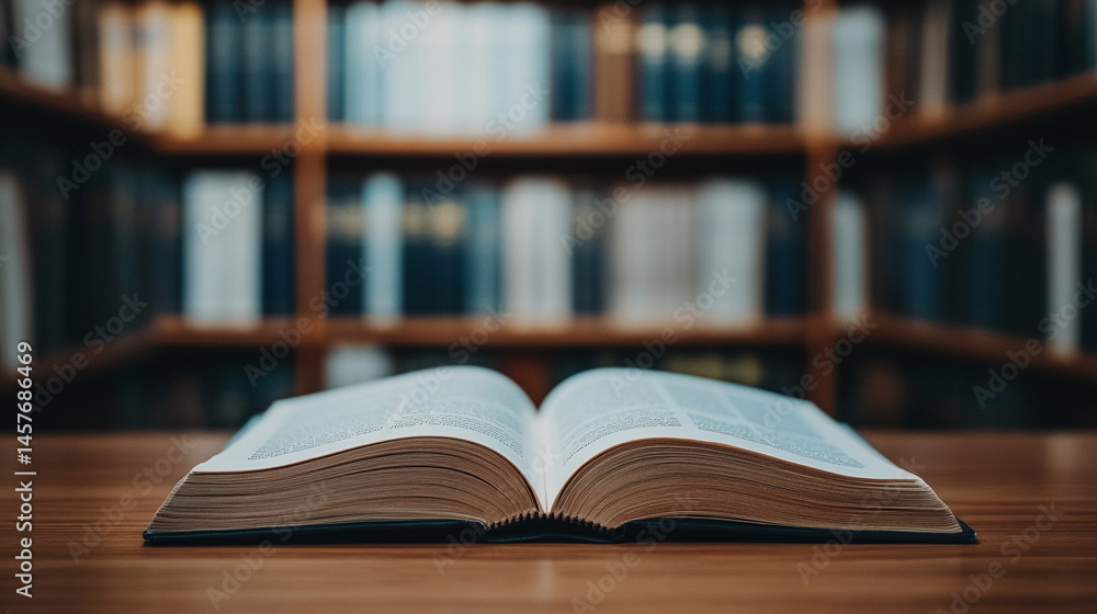 Plakat do Księgarni - Open law book lies on a wooden desk in a courtroom setting, with modern white legal volumes in... #1457686469