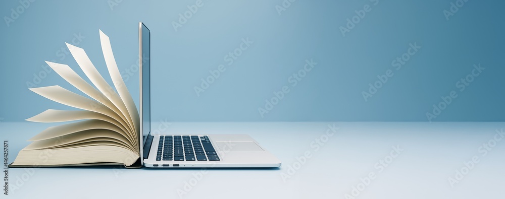 • Open book and laptop placed back-to-back on a clean light blue background, symbolizing modern education and online learning concept.
