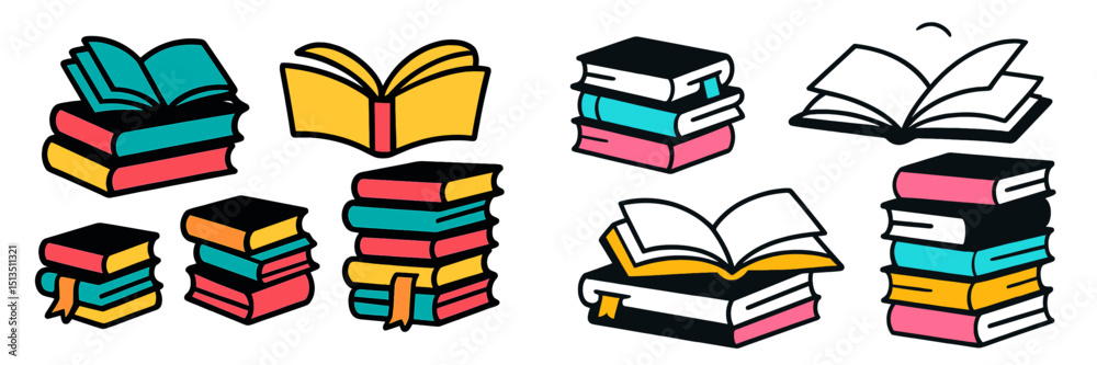 • Colorful stack of books and open book illustrations suitable for educational or creative projects