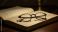 • A pair of classic reading glasses resting on an open book with a warm vintage lamp light ambiance.