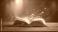 • An enchanting open book emitting magical sparks illuminating the dark background