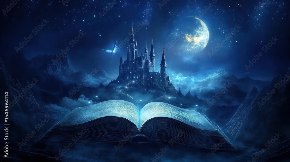 Plakat do Księgarni - Enchanted castle rises from an open book at night. #1546964114