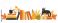 • Flat autumn illustration with books on shelf, cosy cat, leaves, pumpkins and hot drink