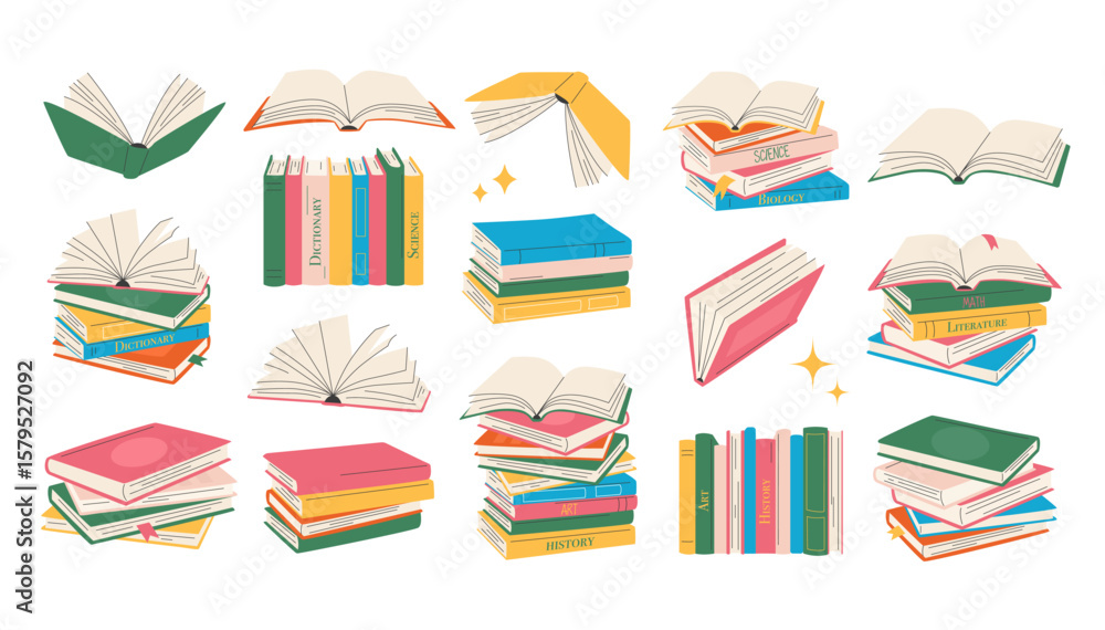 • Books set. Flat style book stack, open book. Reading studying and learning. Back to school.