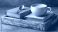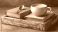 • Cozy scene features a mug of coffee on antique books inside of a distressed wooden tray on textured surface.