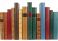 • A row of vintage hardcover books with colorful spines standing upright isolated on a transparent background