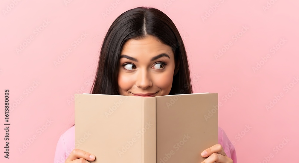 Plakat do Księgarni - A young woman smiles while reading a book against a pink background #1613880005