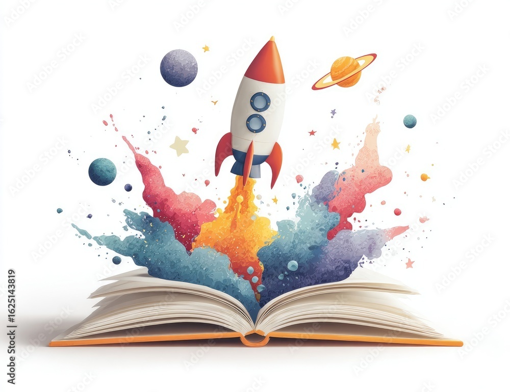 Plakat do Księgarni - Open book with rocket launch exploding in colorful paint #1625143819