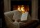 • A person is relaxing on a cozy chair, reading a book with a knit blanket draped over their lap and a warm fireplace in the background