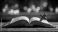 • Open holy blank pages book with wooden cross in soft warm light symbolizing faith and prayer