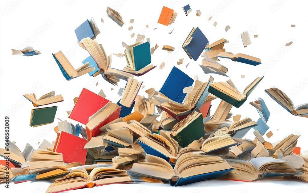 Plakat do Księgarni - Many open books flying and falling in a chaotic explosion of knowledge and learning #1648562009