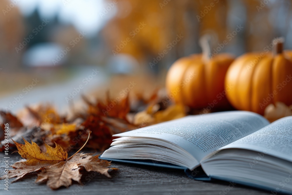 • Open book is surrounded by autumn leaves and pumpkins on a wooden table, creating a cozy fall scene