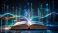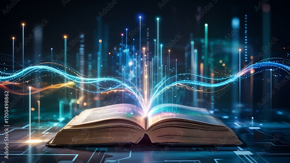 • Ancient open book radiating vibrant digital data streams and futuristic glowing light beams against a dark technological background
