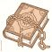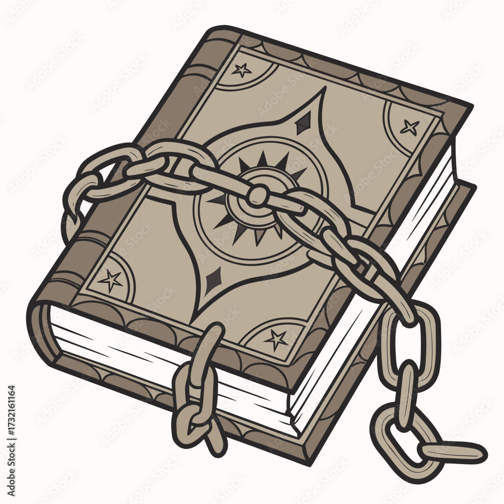 • A closed book with a chain around it, symbolizing restricted knowledge or a secret, the books cover is decorated with mystical symbols