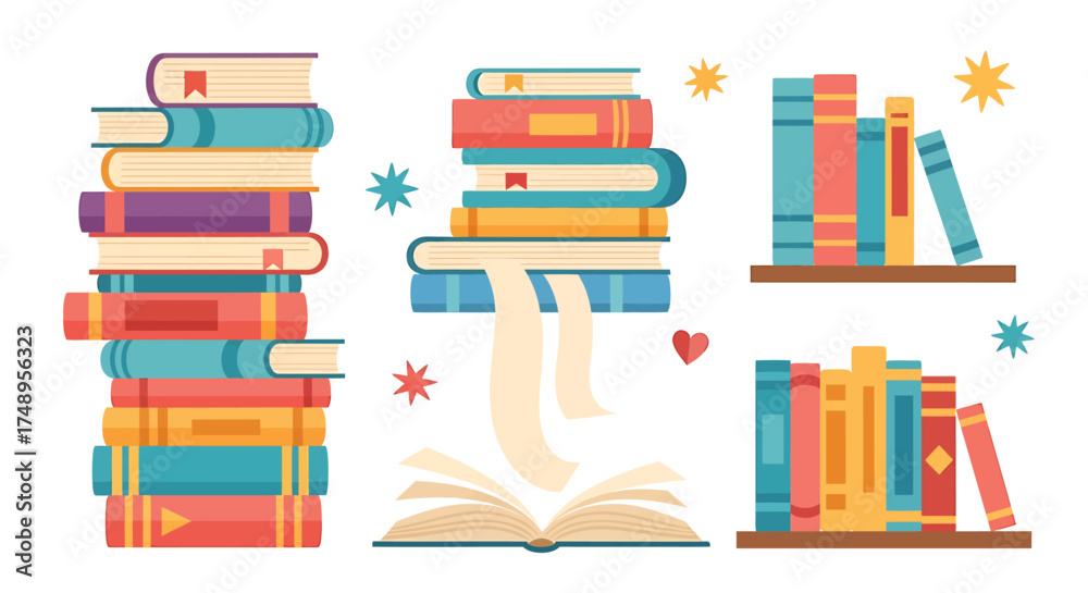Plakat do Księgarni - Illustration of stacks of books and books on shelves, with an open book. #1748956323