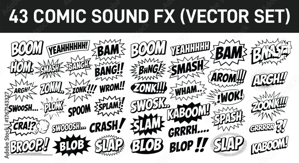 • Collection of 43 comic book sound effects vector set, Black and white dynamic comic book sound effects illustration