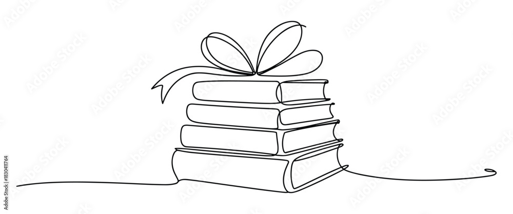 • Stack of Books Tied with a Ribbon and Bow in Continuous Line Art Style gift present