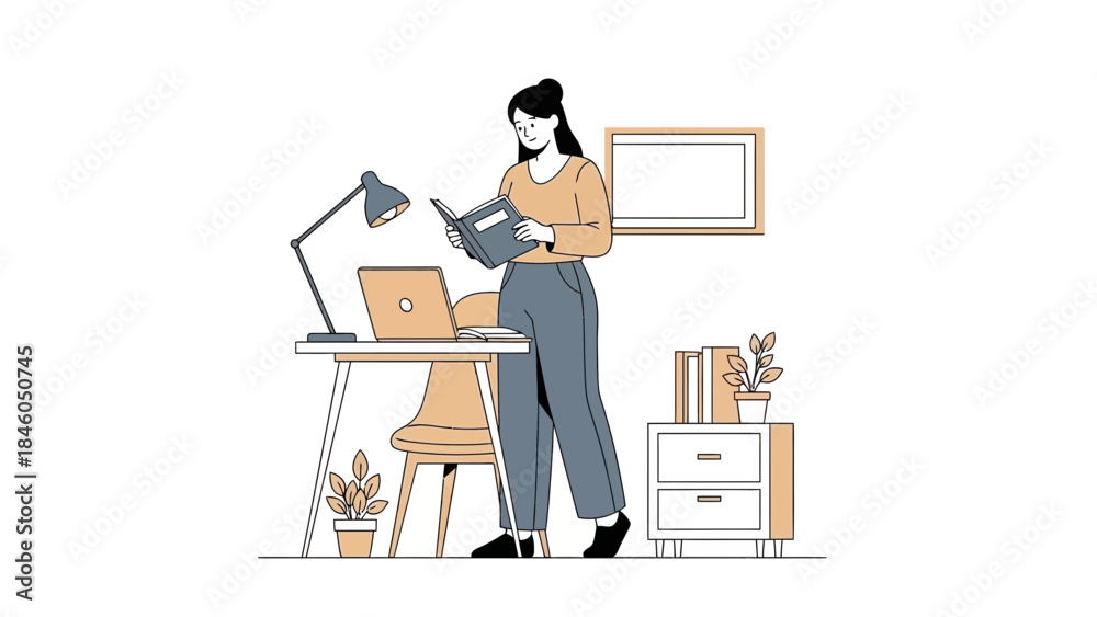 • Illustration of a woman reading a book at her desk in a minimalist home office setup