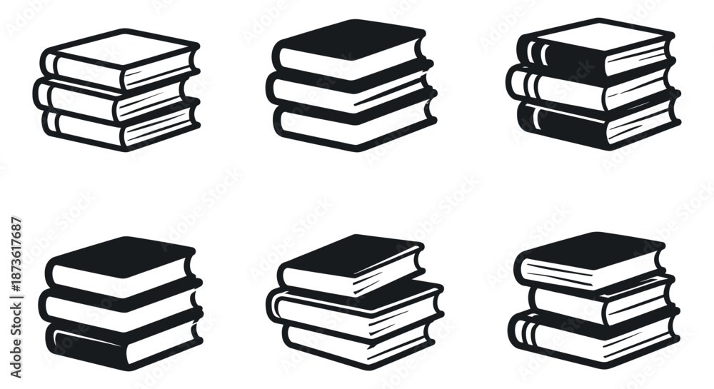 • Line art and solid fill book icon set featuring stacks of books for education and reading
