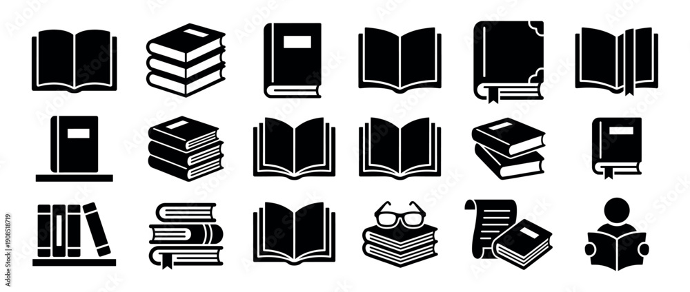 Plakat do Księgarni - Set of black silhouette book icons representing learning, knowledge, and literature, featuring... #1908518719