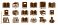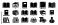• Set of black silhouette book icons representing learning, knowledge, and literature, featuring open pages, stacked volumes, bookmarks, and a reader pictogram