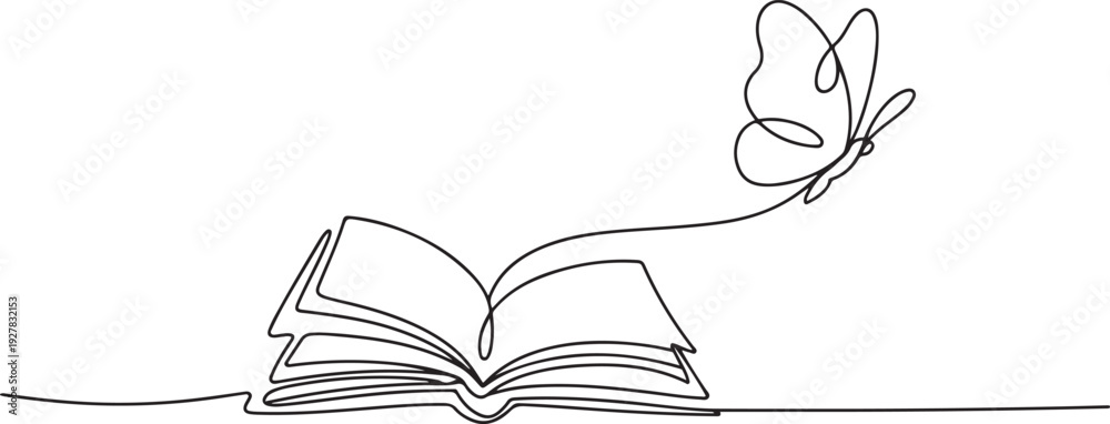 Plakat do Księgarni - Flying book one line drawing with butterfly. Continuous hand drawn contour vector. one line Icon... #1927832153