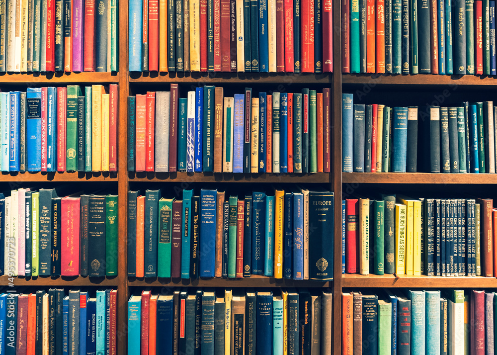 Plakat do Księgarni - English textbooks on bookshelf Library education background #495370723