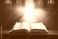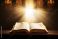 Plakat do Księgarni - Open Holy bible book with glowing lights in church #624884431
