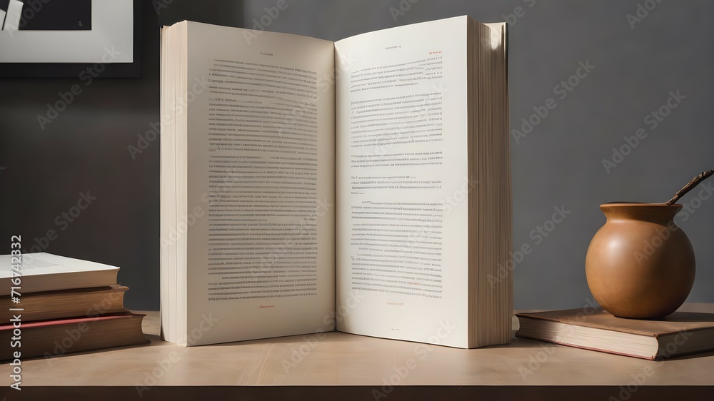 Plakat do Księgarni - An open book stands on a table with books against a gray wall. Background for the curious or dreamy #716742332