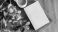 Plakat do Księgarni - Top down view flat lay with white soft cover book mockup coffee mug glasses and blurred plant in... #789082834