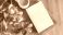 • Top down view flat lay with white soft cover book mockup coffee mug glasses and blurred plant in the foreground on a brown wooden table Customizable template with concept of literature : Generative AI